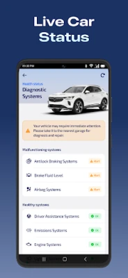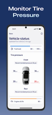 > Ensure drive safety before departure. Remote CHECK LIVE vehicle engine status including tire pressure, oil / EV battery level, and receive safety alerts to avoid risks of road accidents or engine breakdown when driving.