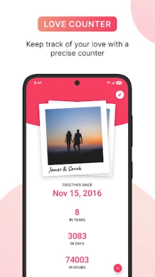 Love Counter & Anniversary display 🔢 Have you always wondered how long you and your loved one have been together? Not anymore, because this app can provide you with detailed information about how long you've been together. You can also track other meaningful days, such as your wedding, engagement, friendship anniversary, or any other day.