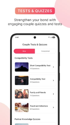 Tests & Quizzes ✅ Discover how much you have in common and how well you know each other through a series of fun tests. Choose between free tests or a selection of premium tests that will give you a deeper understanding of your common interests and help you strengthen your relationship.