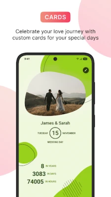 Multiple Special Days & Custom Cards 🎨 Add and celebrate more than just your anniversary! Whether it’s the day you got married, engaged, became friends, or any other meaningful day — you can now track them all. For each special day, create and personalize beautiful Cards using a variety of themes, colors, and styles to truly make them your own.